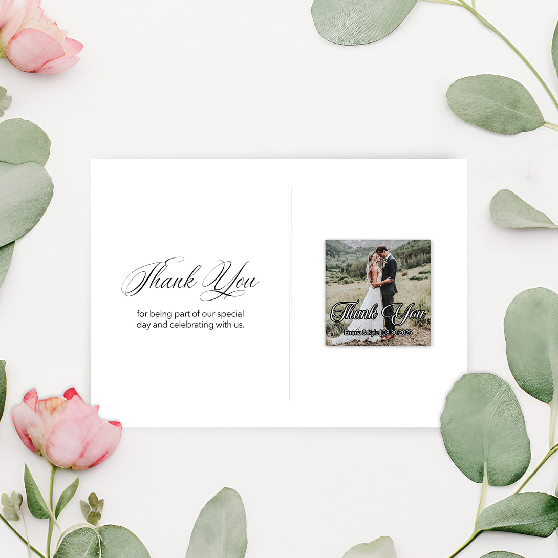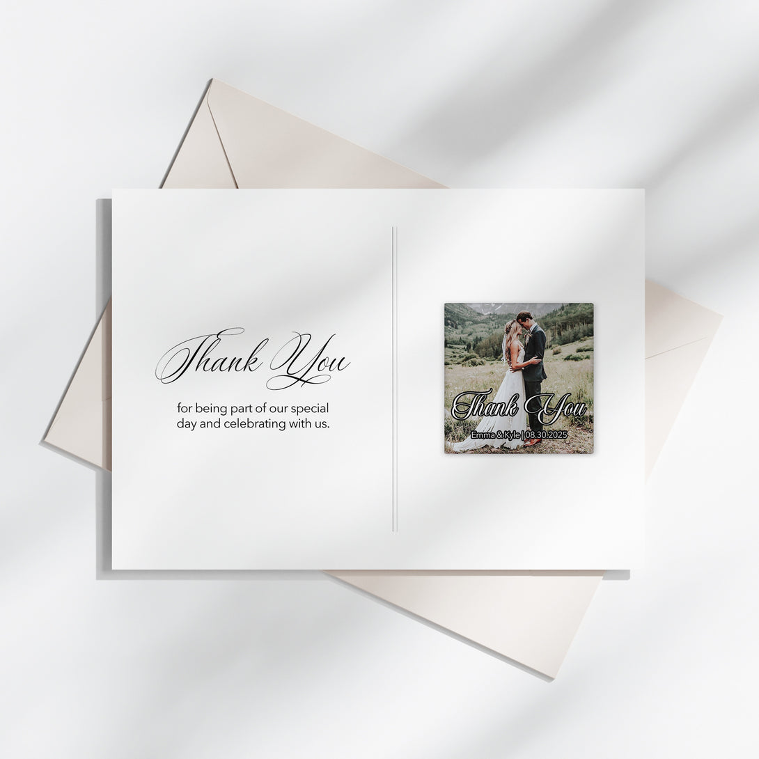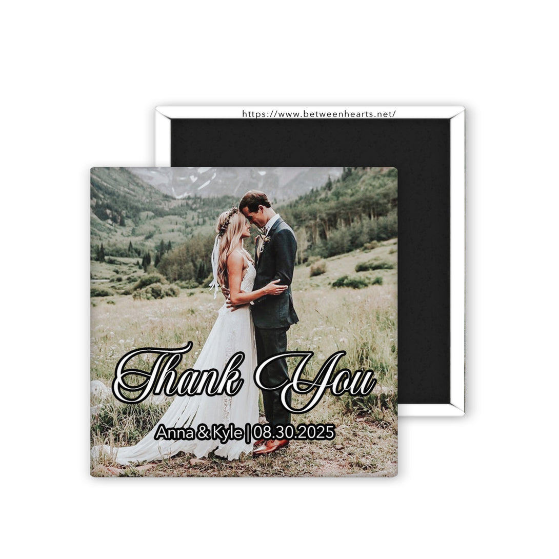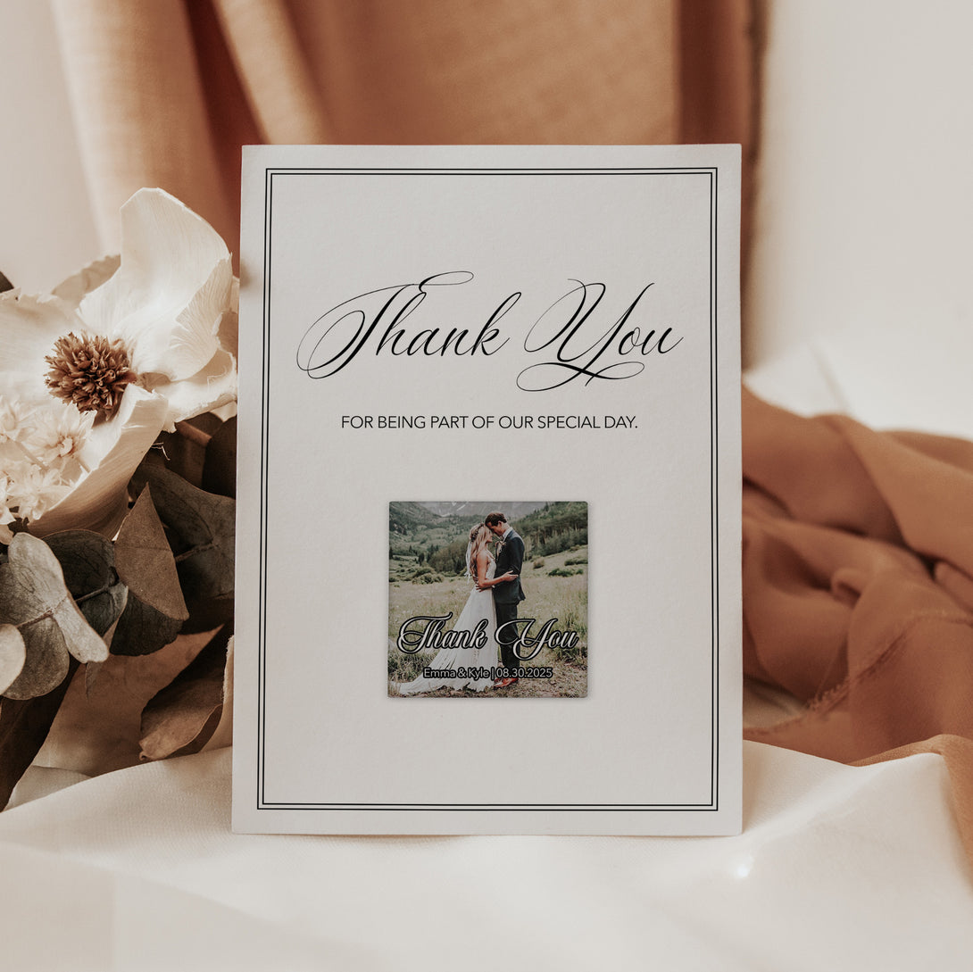 Thank your wedding guests with these fun thank you favors. The minimal design keeps the focus on you and your partner, and the small magnets take up little space on the fridge.